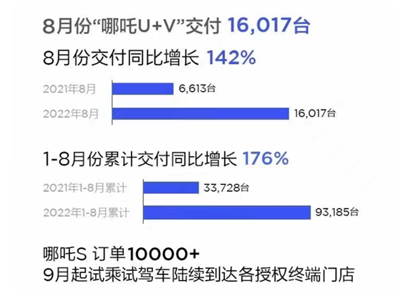 今年1-8月,哪吒汽车已累计交付93185台,同比增长176%。哪吒汽车品牌自成立以来,截止2022年8月,累计交付量189162台。哪吒汽车的爆发式增长和“质变”,推动品牌向新、向上。8月,哪吒汽车在品牌、产品、全球化等方面齐头并进,取得多项里程碑式重要成果。