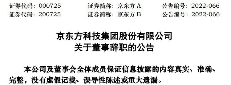 2022年9月6日,京东方科技集团股份有限公司发布公告称,京东方董事范元宁先生已向董事会提交书面辞呈。因工作调整原因, 范元宁先生申请辞去公司董事及董事会专门委员会相关职务,辞职后将不再担任公司任何职务。