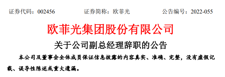 2022年9月5日,欧菲光集团股份有限公司发布公告称,欧菲光副总经理杨晓波先生已向董事会提交书面辞呈。杨晓波先生因个人原因辞去公司副总经理职务,辞职后其不再担任公司任何职务。