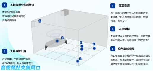 此外,基于元宇宙场景中必备的空间音频,声网可以在场景里面对声音来源方向有更多的真实感和方位感。