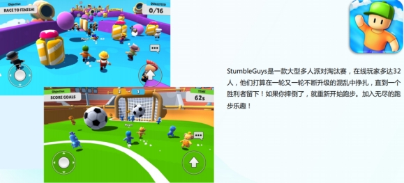 如《StumbleGuys》,把类似鱿鱼游戏、大逃杀的玩法带入到跑图应用中,很受用户欢迎,这说明玩法的构建是一个非常重要的因素。