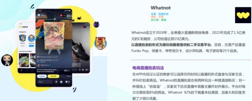 「Whatnot」,是一个以直播拍卖的形式为潮玩收藏者提供二手交易的平台。过往直播电商更多的想去打造爆款,Whatnot是反其道而行之,将非标产品通过直播、用户和主播之间的类似拍卖形式进行互动,利润空间大,用户粘度高。